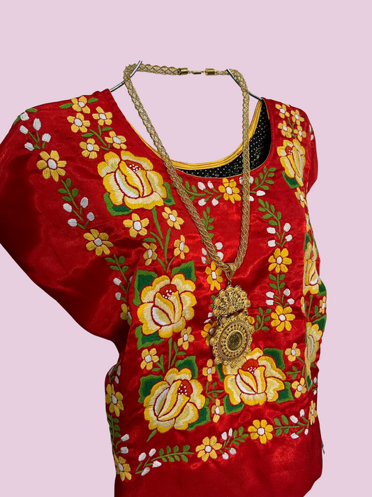 Huipil en fondo rojo, bordado a mano en tono amarillo