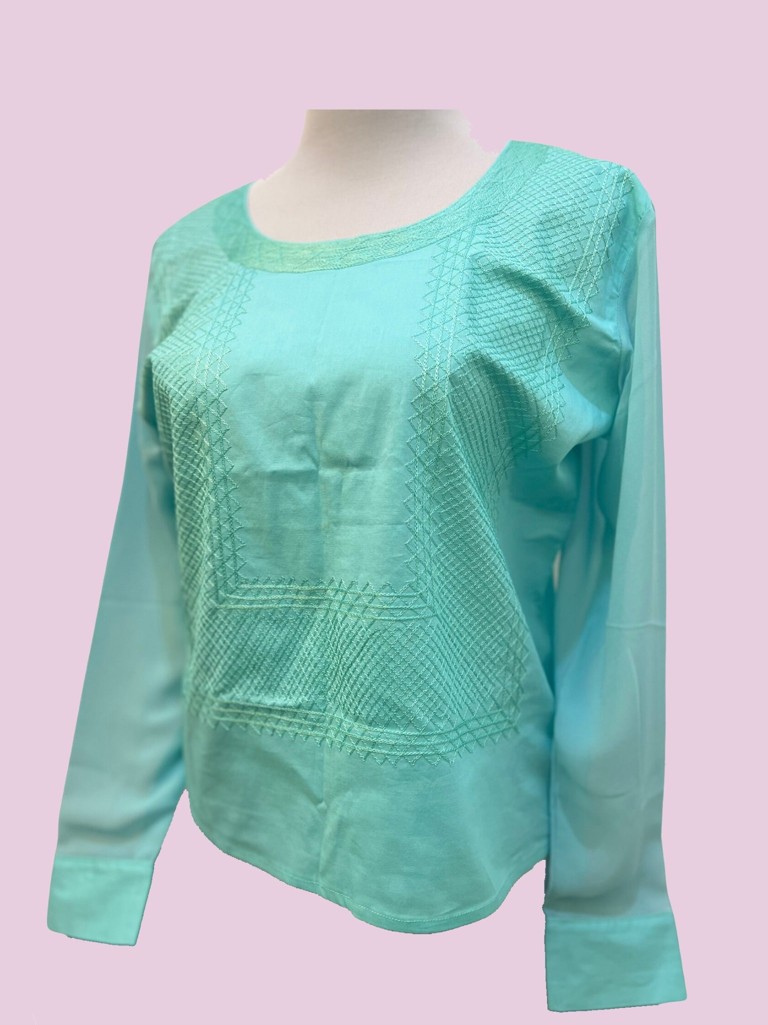 Blusa artesanal de cadenilla fina con manga larga turquesa