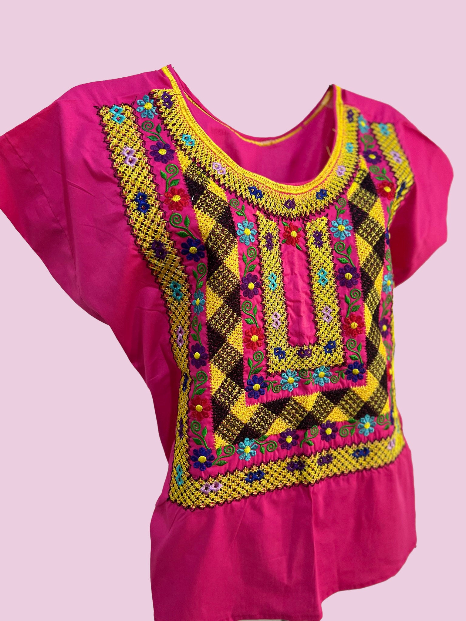 Esta encantadora blusa combina la elegancia del tejido a máquina con flores y cadenilla sobre un fondo fiusha suave y femenino. Cada detalle floral ha sido cuidadosamente tejido para resaltar la belleza y distinción de esta prenda única.