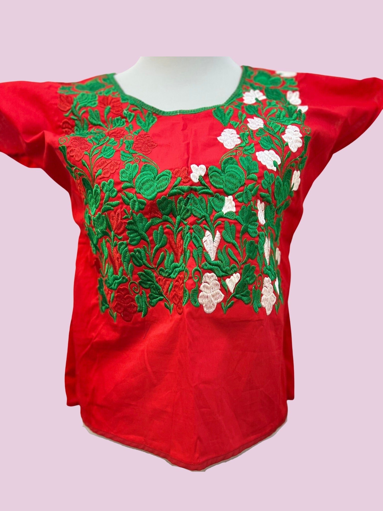 Esta encantadora blusa en vibrante tono rojo presenta un elegante diseño de flores bordadas a máquina en tonos verdes y blancos. Cada detalle ha sido cuidadosamente elaborado, creando una prenda única que combina sofisticación y frescura en un solo lugar.