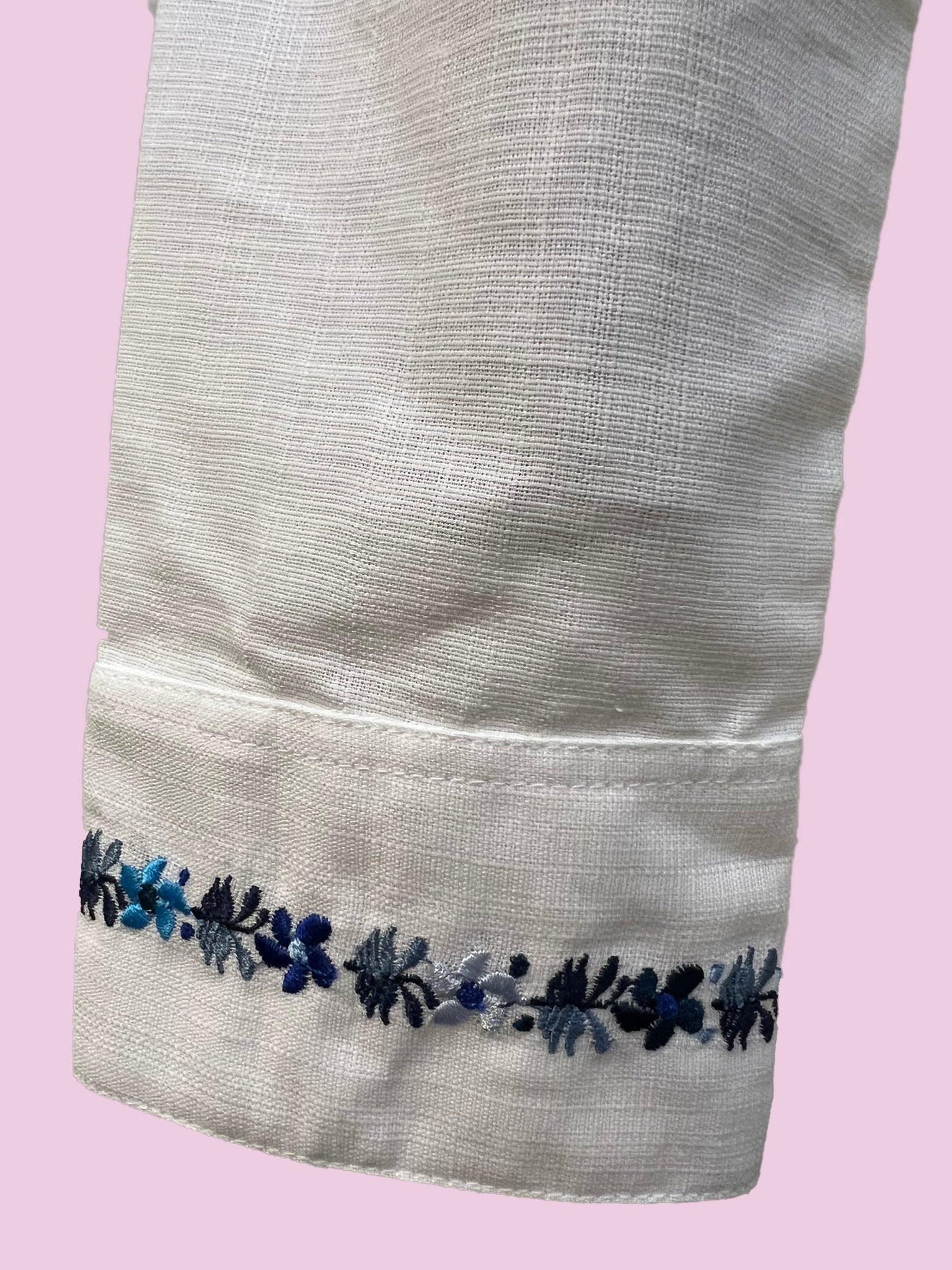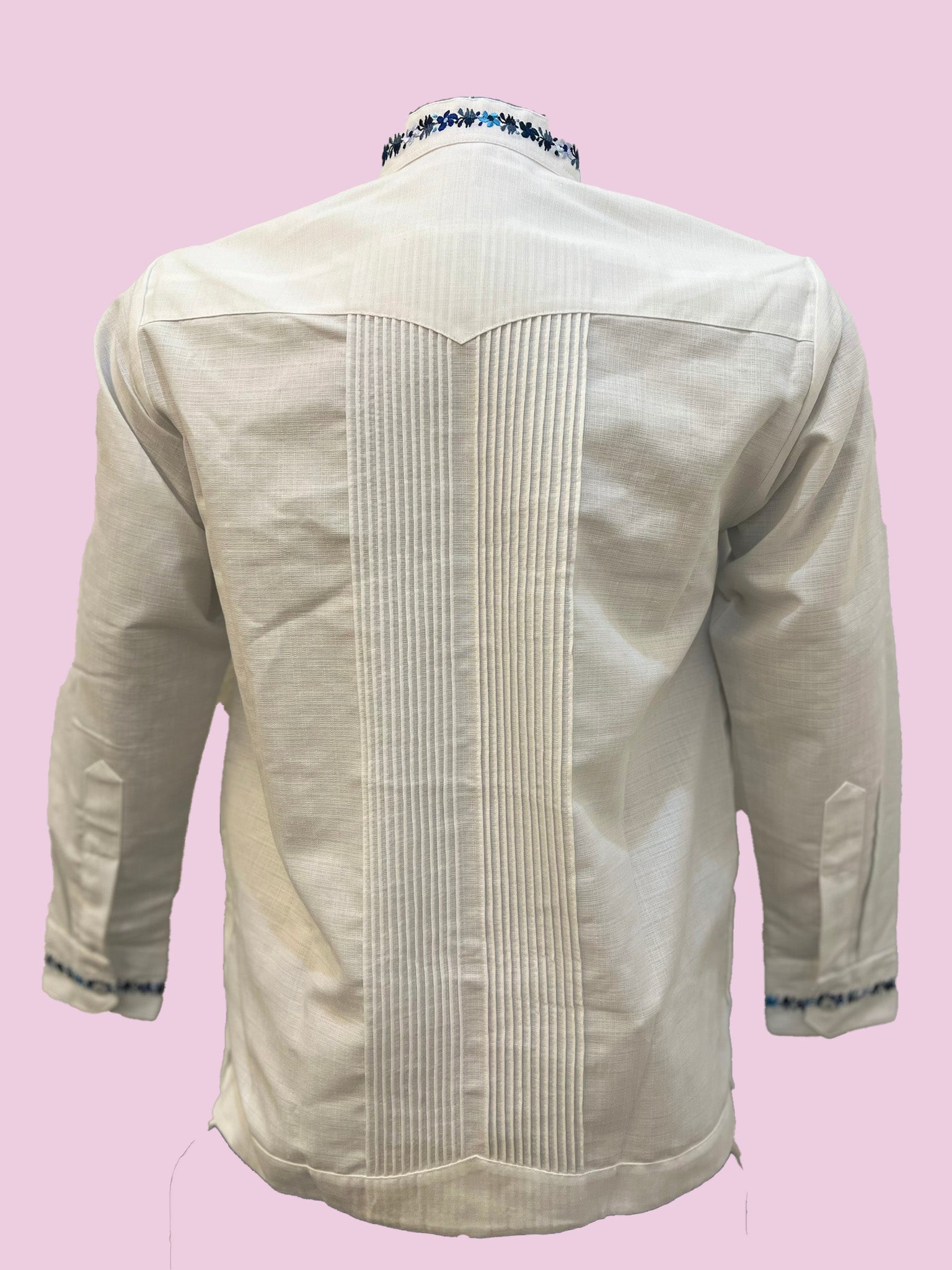 Sumérgete en la frescura y elegancia de nuestra guayabera de lino en tono blanco. Esta prenda, confeccionada en una tela suave y fresca, es perfecta para enfrentar los días cálidos con estilo. Los bordados a máquina en un vibrante tono azul destacan sobre el fondo blanco, creando un contraste cautivador. El cuello mao le otorga un toque moderno y sofisticado.