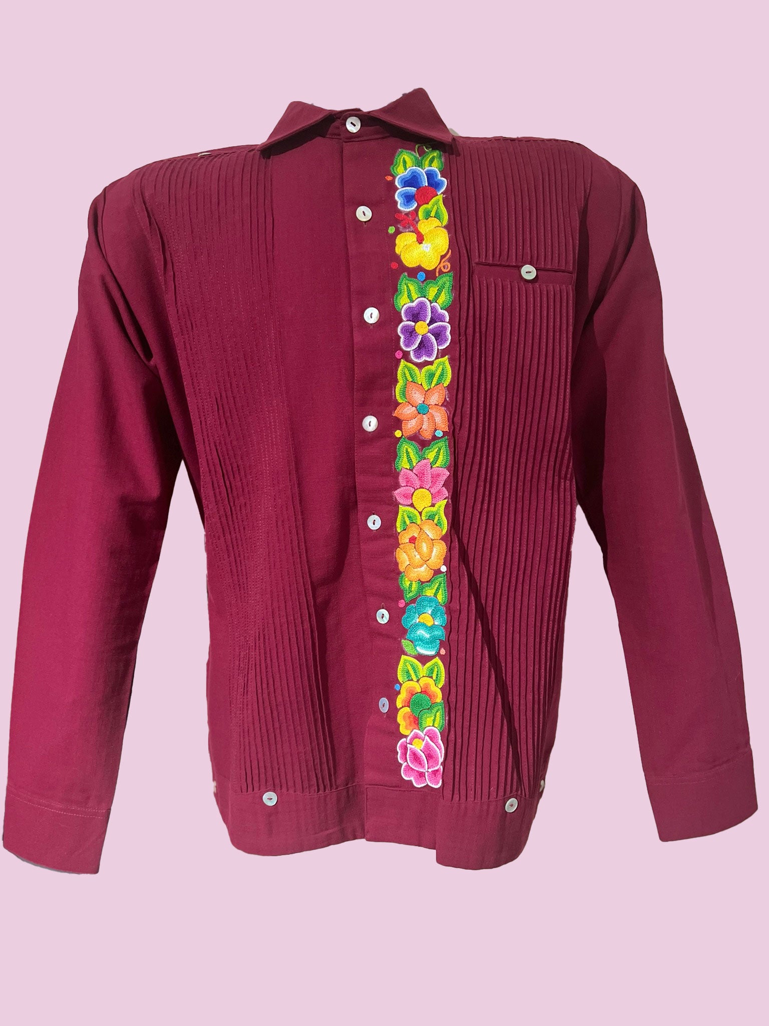 Explora la magia del Istmo de Tehuantepec con nuestra guayabera de lino en tono vino, adornada con flores tejidas a mano. Cada flor es un tributo a la destreza y pasión de las artesanas locales, que con cada puntada crean una pieza que encapsula la rica herencia cultural de la región.