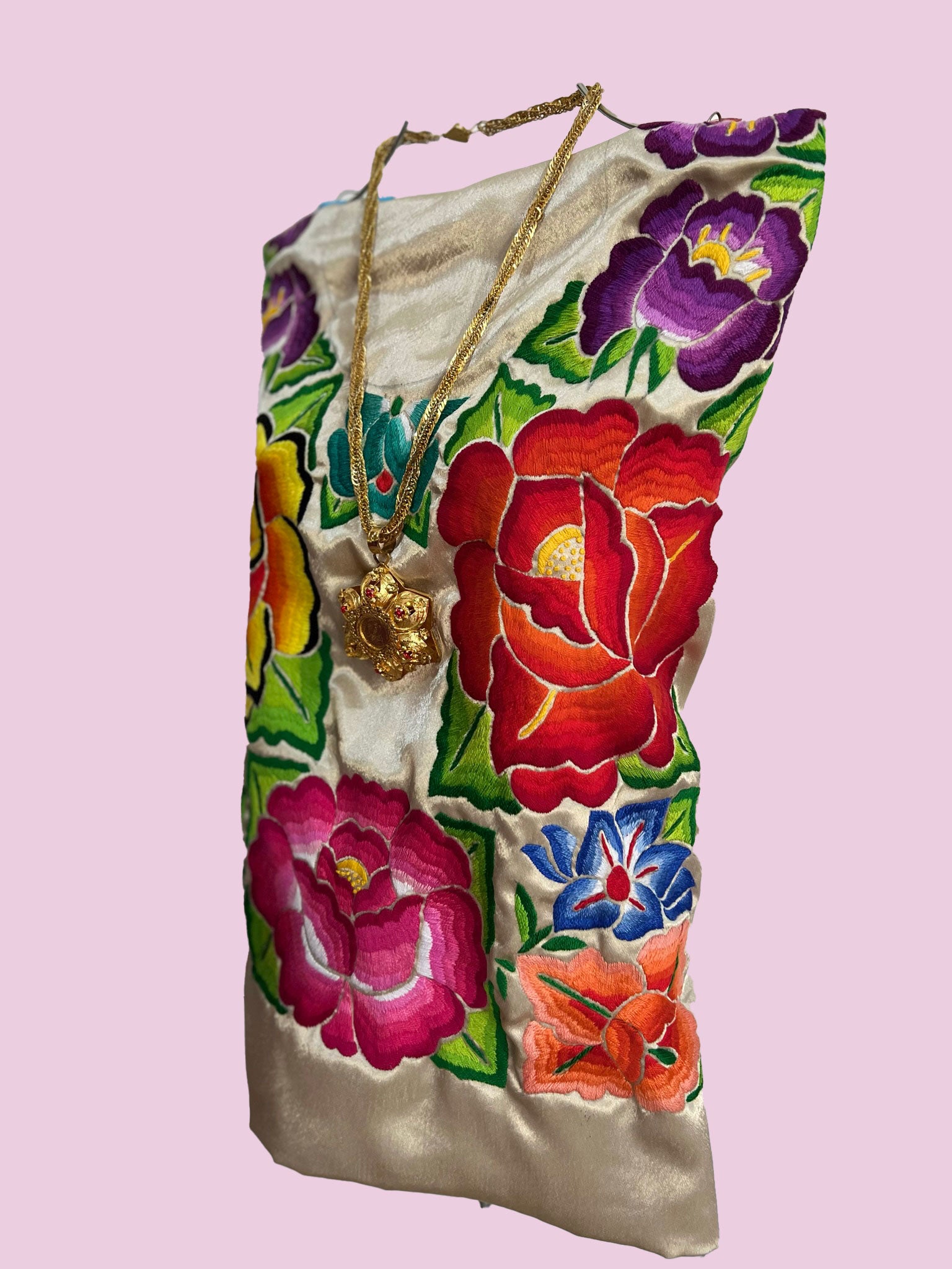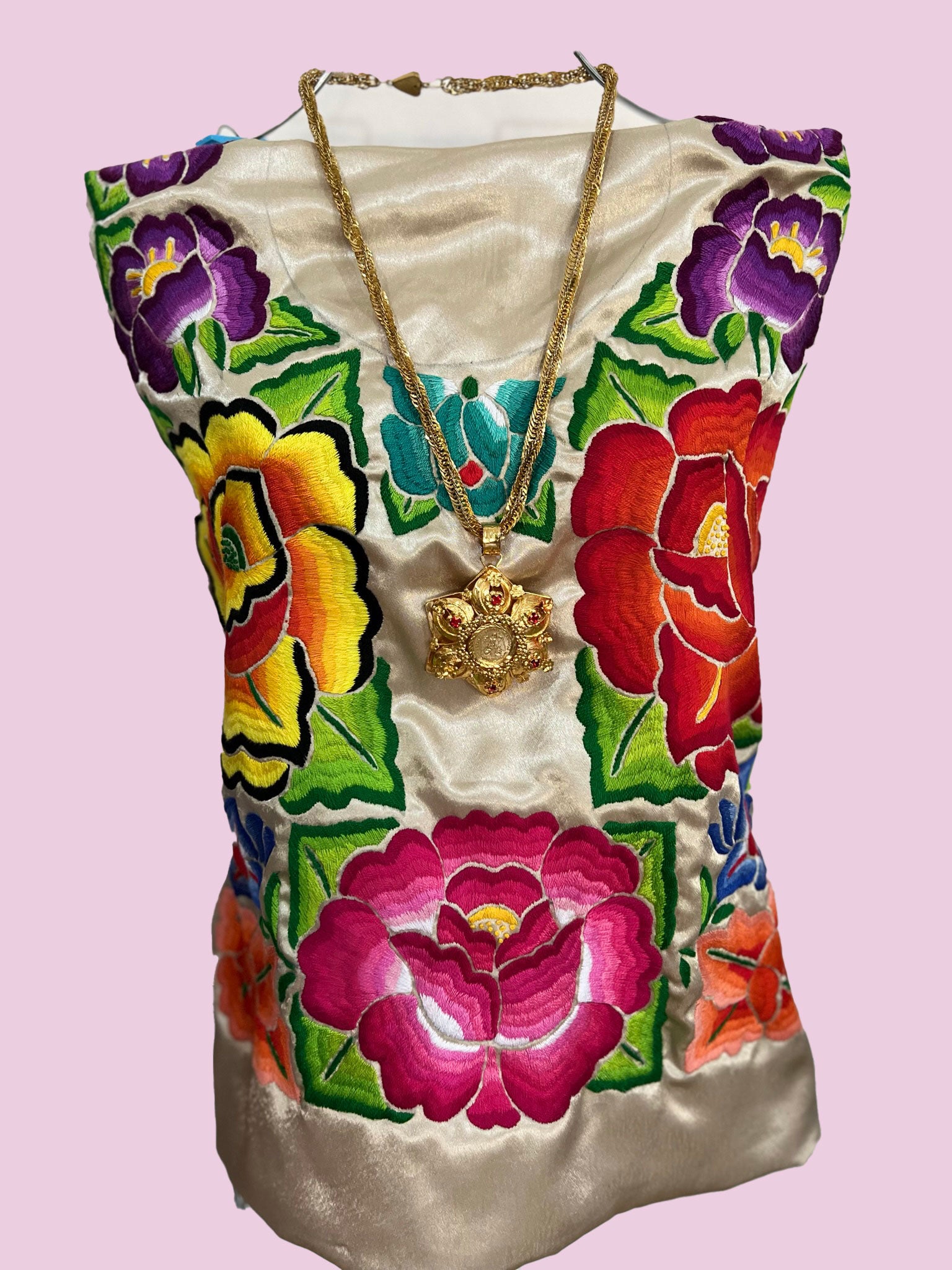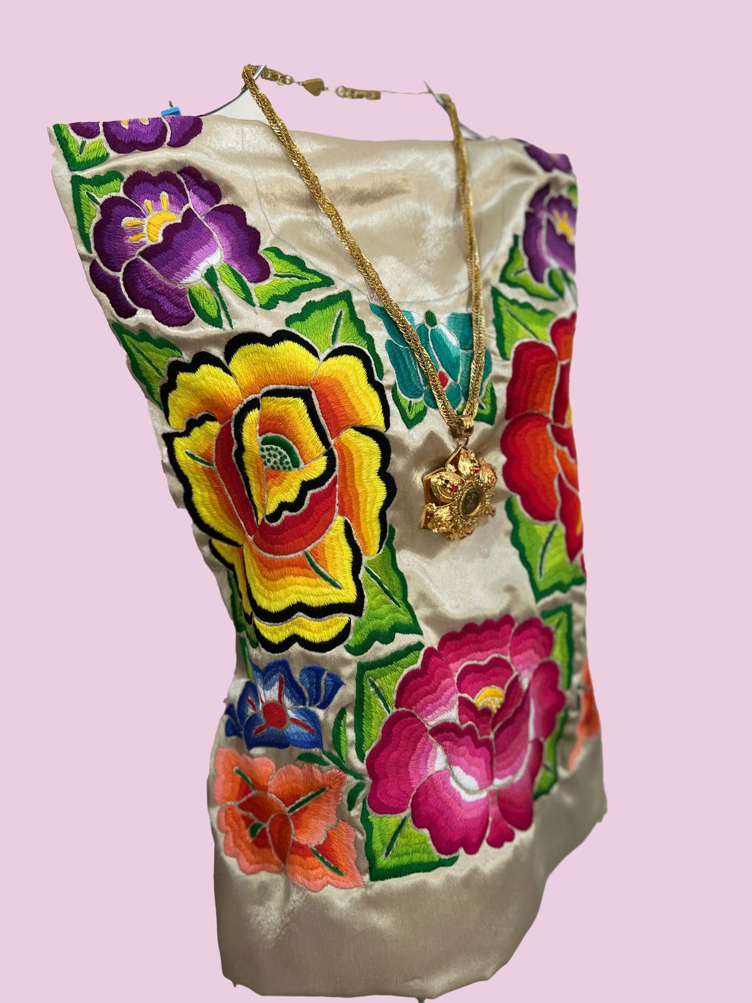 Exquisito y distinguido, nuestro huipil se distingue por su diseño original y elegante. Cada detalle está meticulosamente bordado a mano en tela crepé color arena, realzando su belleza con seda de la más alta calidad. Un tesoro de artesanía y estilo que captura la esencia única del Istmo de Tehuantepec.