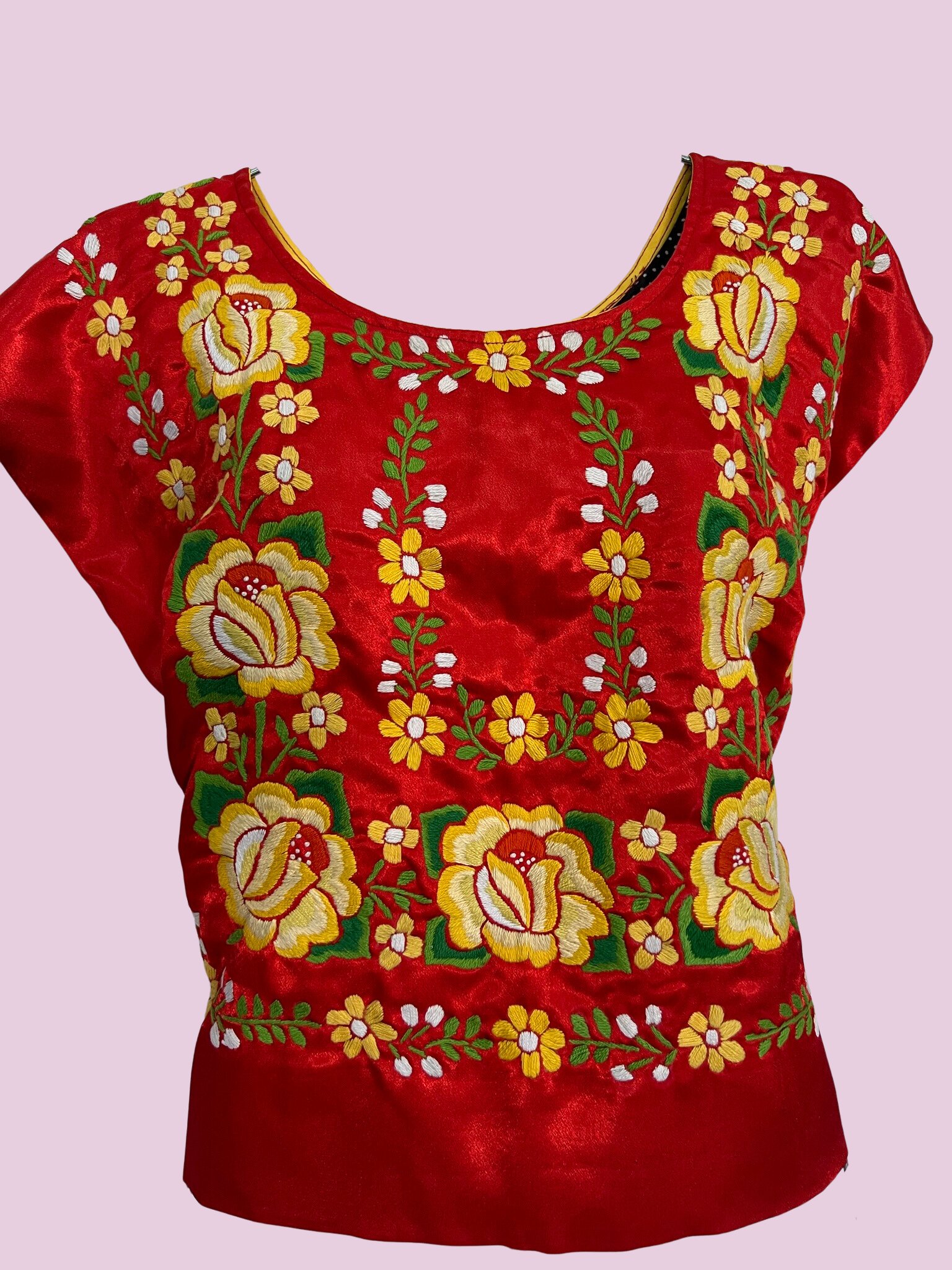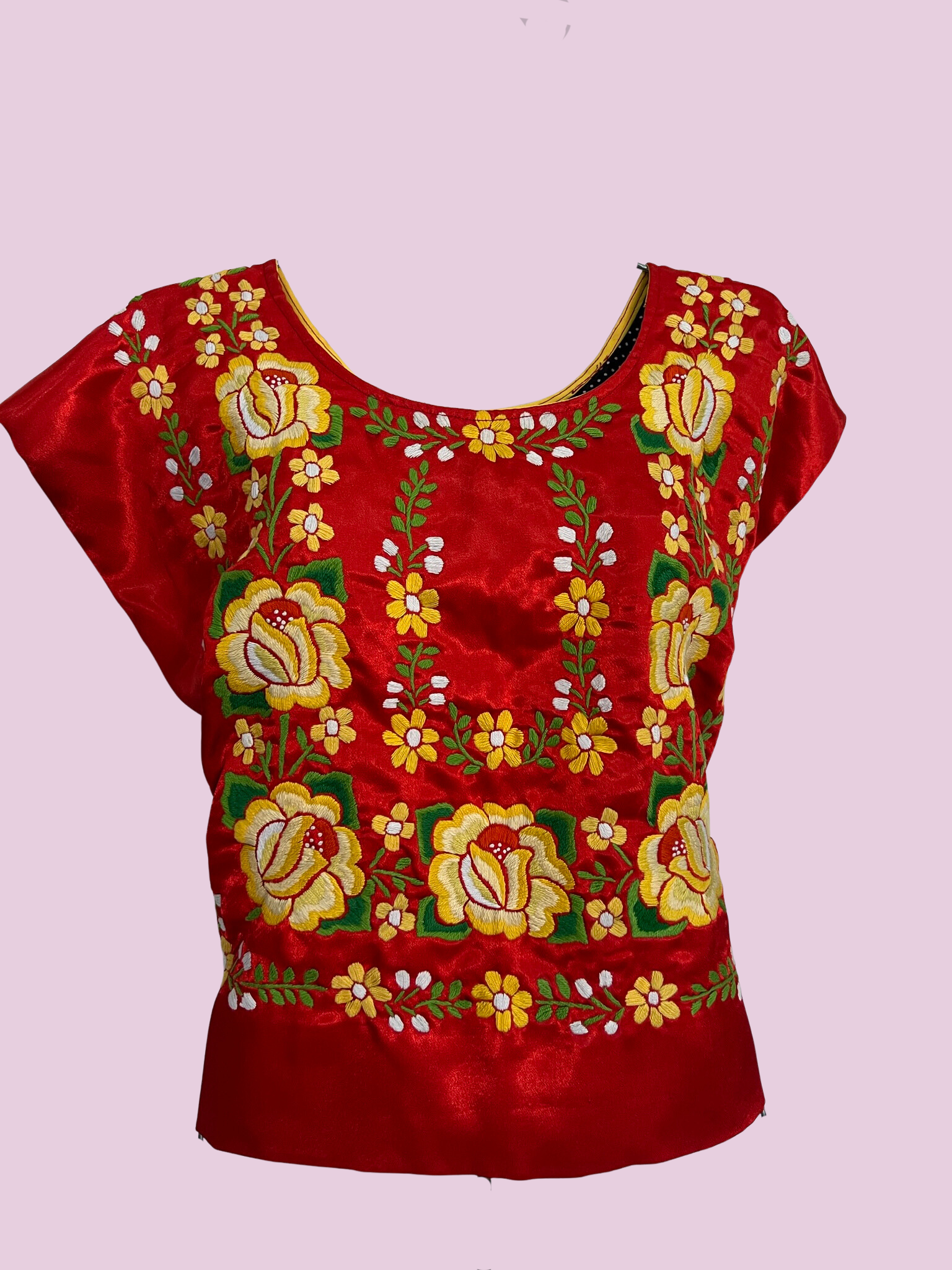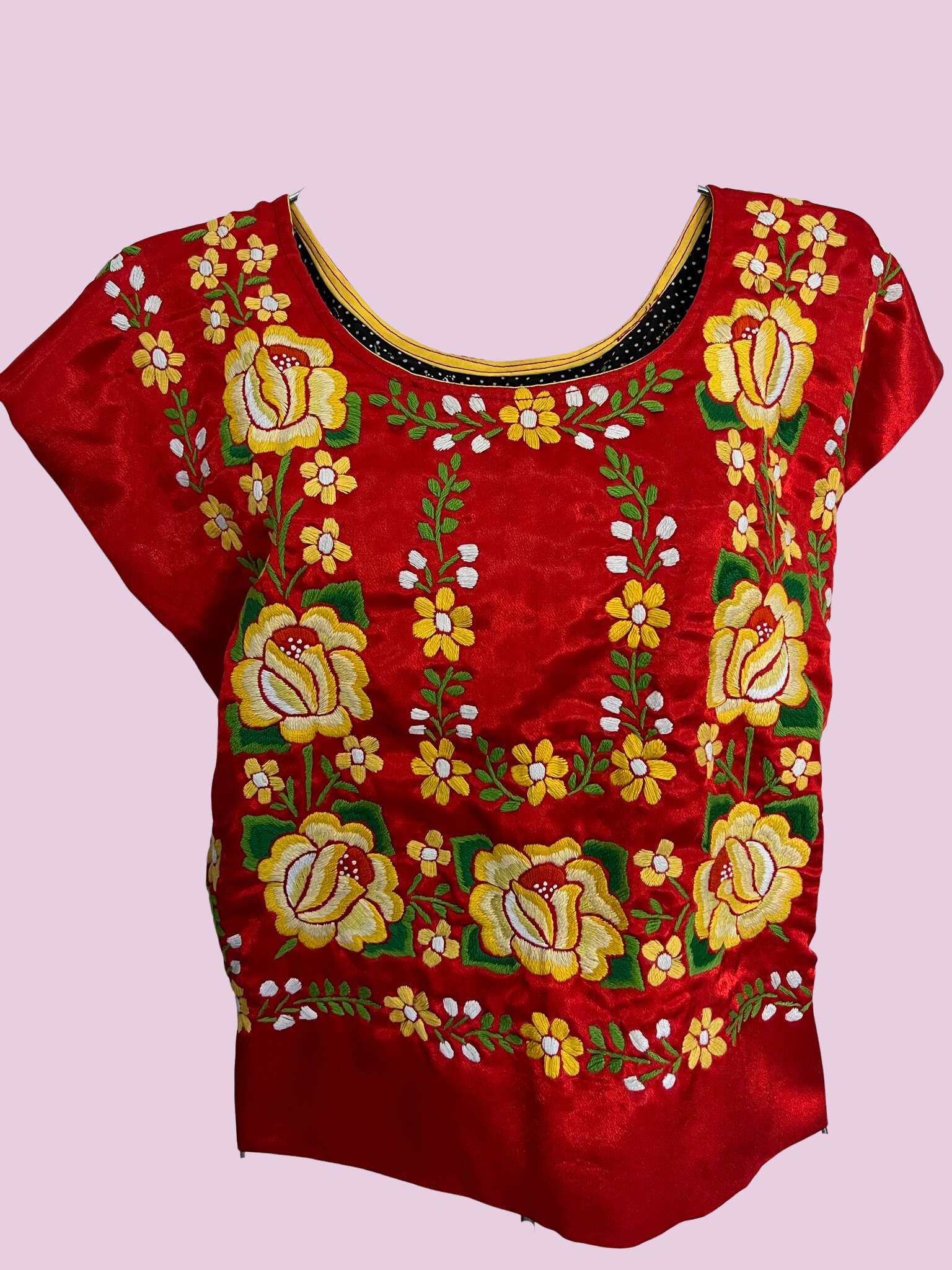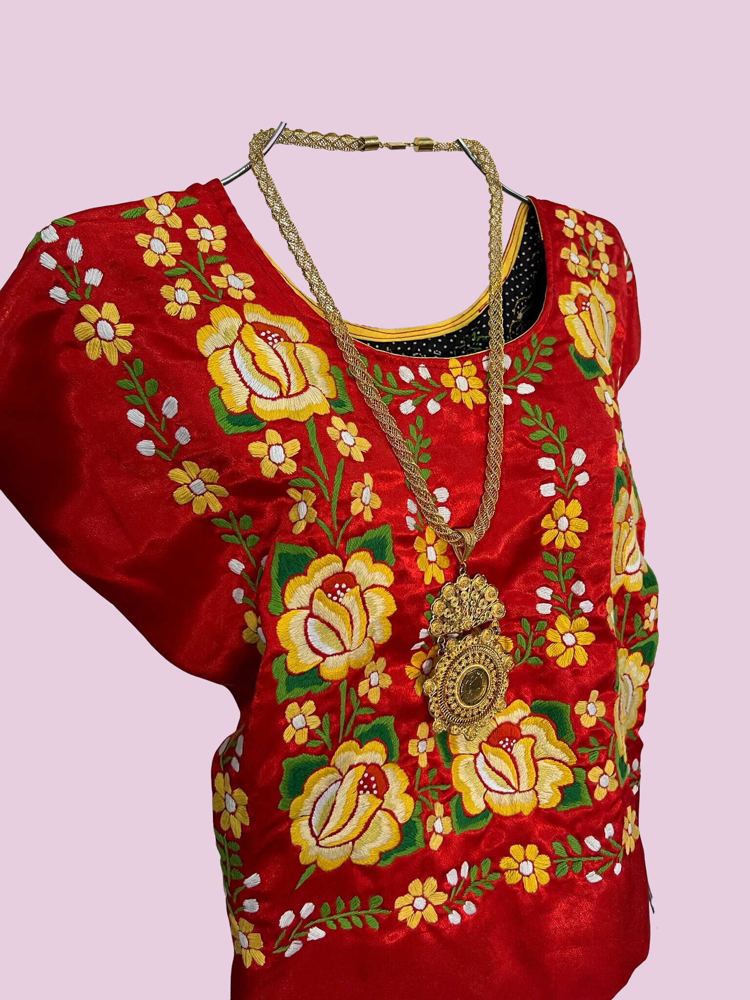 Un hermoso huipil de talla mediana a grande en vibrante tono rojo, bordado a mano con meticulosidad en un encantador tono amarillo. Confeccionado en suave tela crepé, esta prenda combina la tradición artesanal con la elegancia y el colorido de la cultura mexicana.
